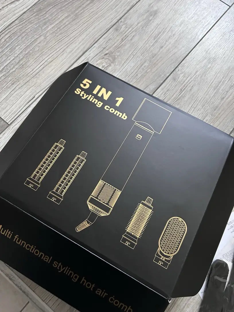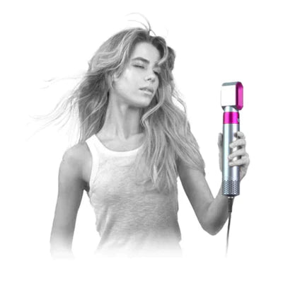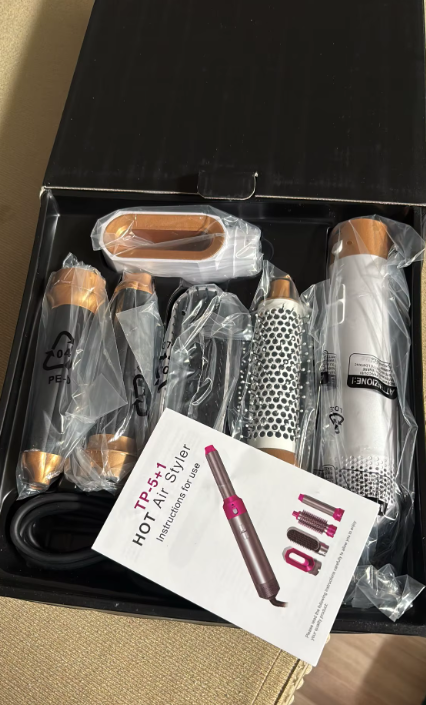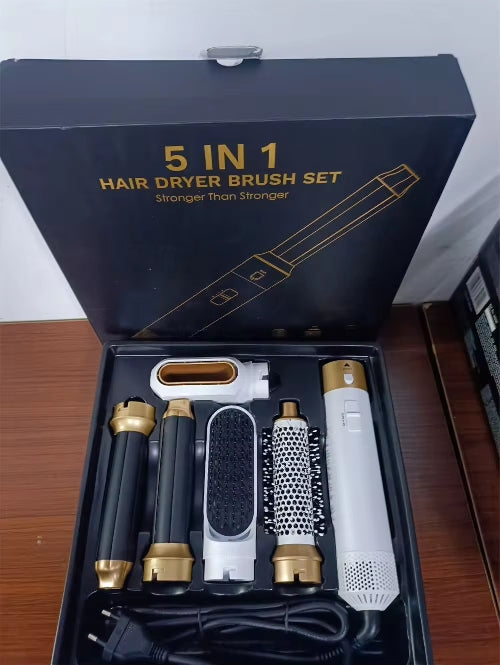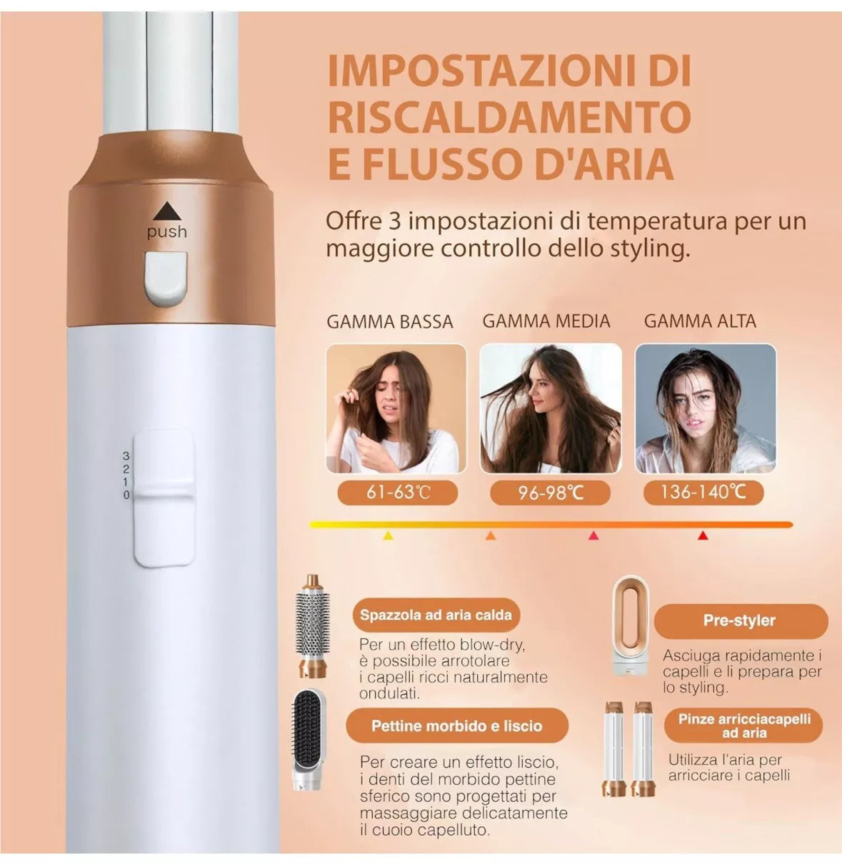 Il kit comprende il corpo principale e 5 accessori: beccuccio asciugante, 2 barrel auto‑arriccianti, spazzola lisciante e spazzola tonda volumizzante