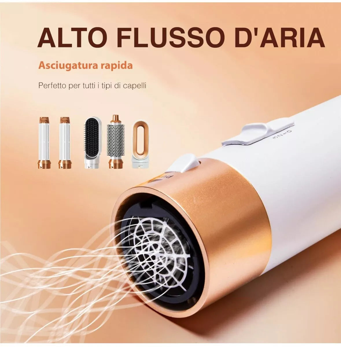 Il kit comprende il corpo principale e 5 accessori: beccuccio asciugante, 2 barrel auto‑arriccianti, spazzola lisciante e spazzola tonda volumizzante